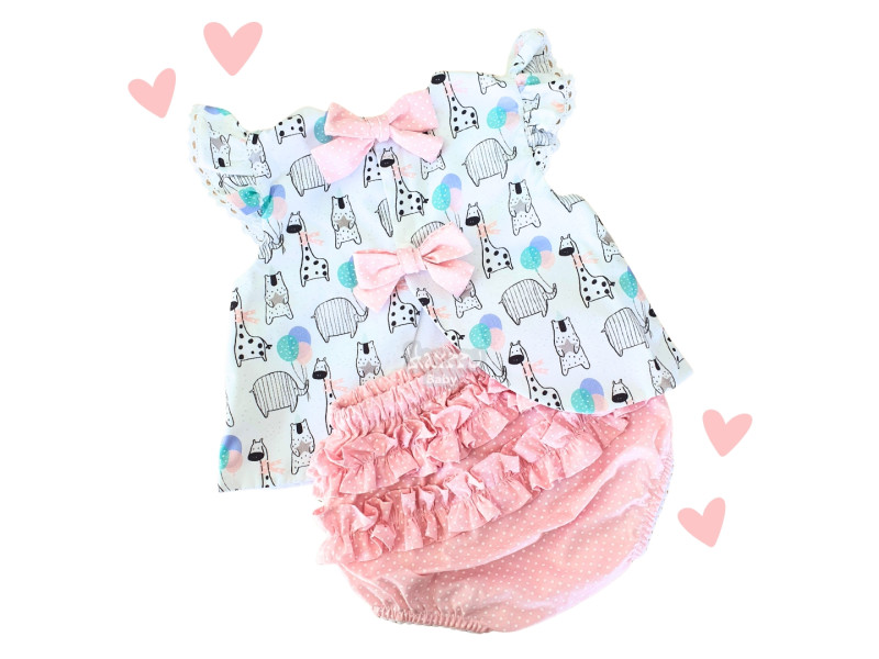 Uma linda blusinha, com detalhes em rendinha nas mangas e dois laços nas costas, e um tapa fralda com charmosos babadinhos fazem a combinação perfeita nesse look super delicado e confortável.