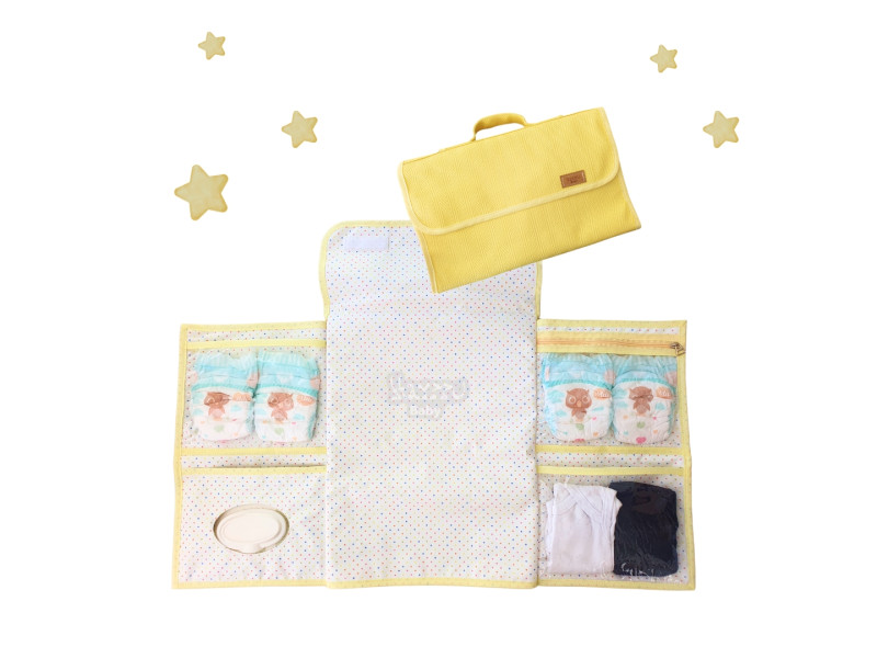 O trocador portátil possui quatro compartimentos amplos para acomodar as fraldas, pomada, pacote de lenços umedecidos e roupinha. Quando fechado, vira uma bolsa para facilitar o transporte.