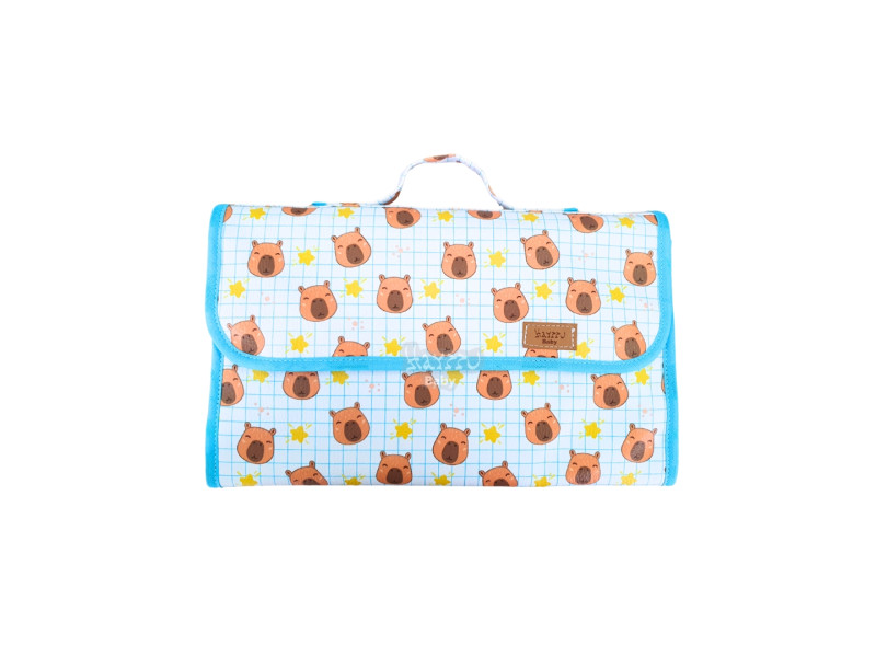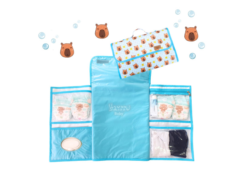 O trocador portátil possui quatro compartimentos amplos para acomodar as fraldas, pomada, pacote de lenços umedecidos e roupinha. Quando fechado, vira uma bolsa para facilitar o transporte.