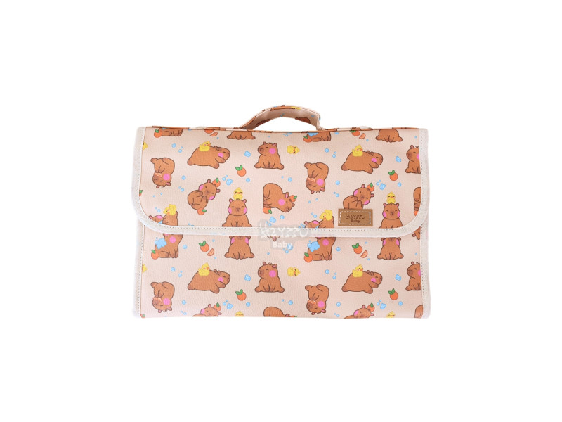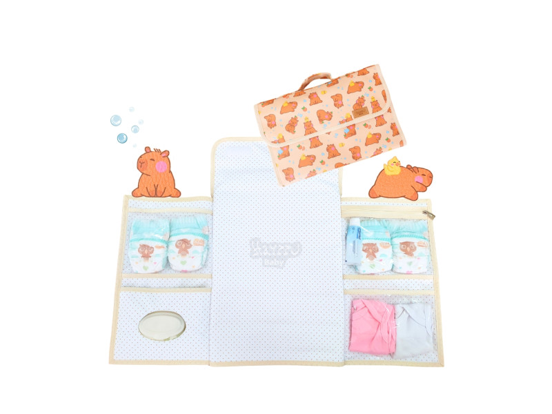 O trocador portátil possui quatro compartimentos amplos para acomodar as fraldas, pomada, pacote de lenços umedecidos e roupinha. Quando fechado, vira uma bolsa para facilitar o transporte.